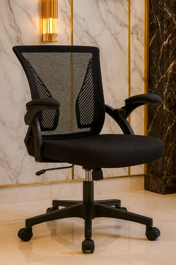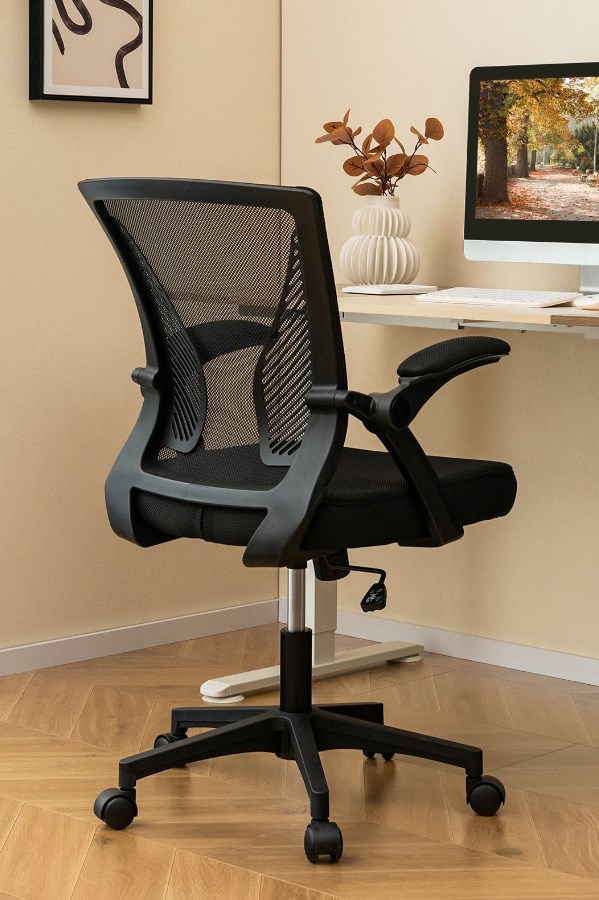 The seat is generously padded with durable elastic sponge and covered in black air mesh fabric, ensuring a cool and comfortable experience during extended work sessions. The chair also includes flip-up padded armrests, covered in the same fabric, which can be tucked away for extra space allowing for a seamless transition between work and relaxation.