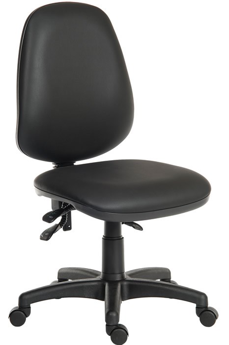 The Vinyl Operator Chair High Back Task Chair features a 2 lever adjustable mechanism and a sculptured lumbar and spine support to increase comfort. Easily wiped clean to reduce germs.